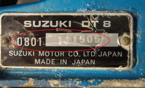 Serienumret börjar på "1" och motorn är blå så vi kan med säkerthet säga att detta är en Suzuki 8hk tvåtaktsmotor från 1981.