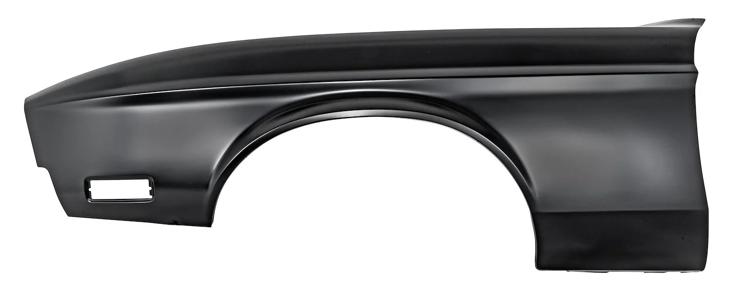 Främre vänster (förarsida) skärm av högkvalitativt stål, avsedd för Ford Mustang 1971–1972. Denna reproduktionsskärm är EDP-belagd för rostskydd, har korrekta konturer och förskurna öppningar för sidomarkeringsljus, vilket gör den klar för förberedelse och lackering