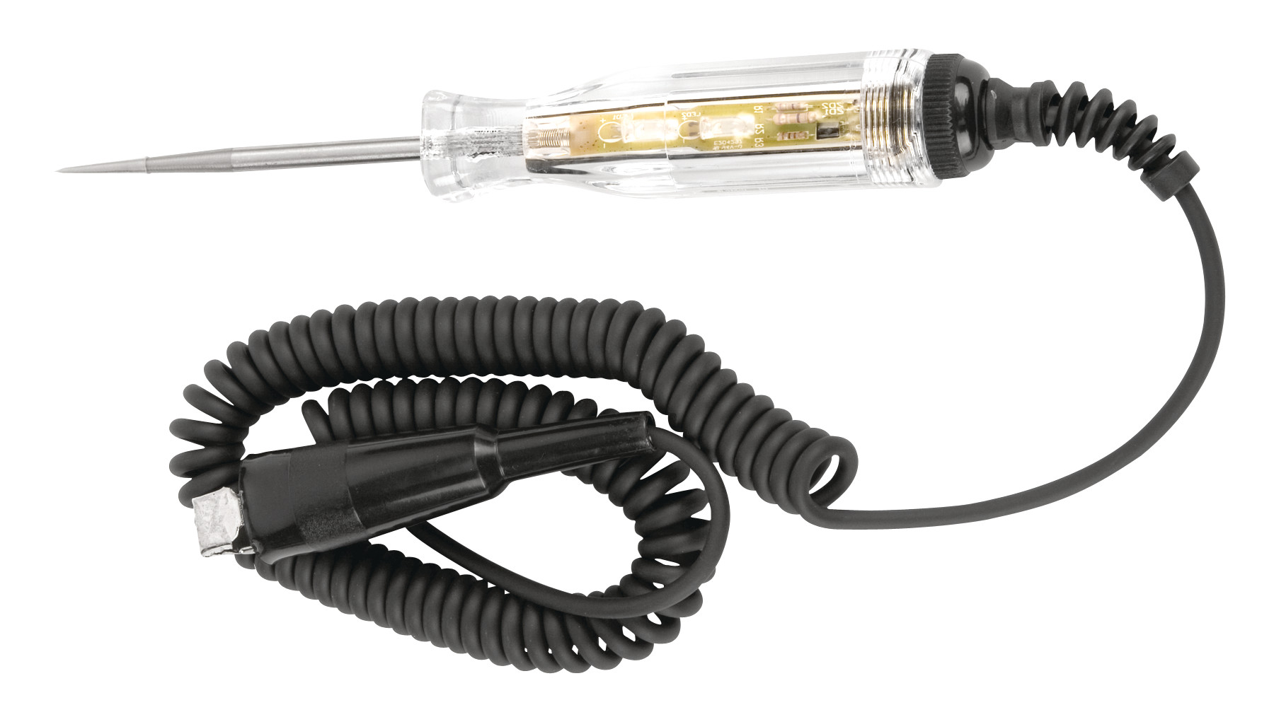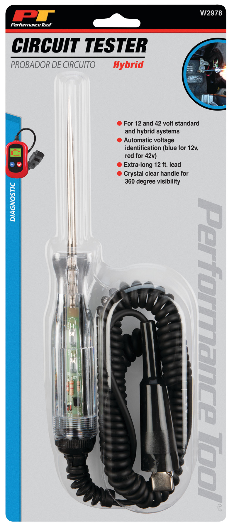 Kretsprovmejsel. For 12 and 42 volt standard and hybrid systems. Automatic voltage identification with blue LED (12v) and red LED (42v). Extra-long 12' lead.